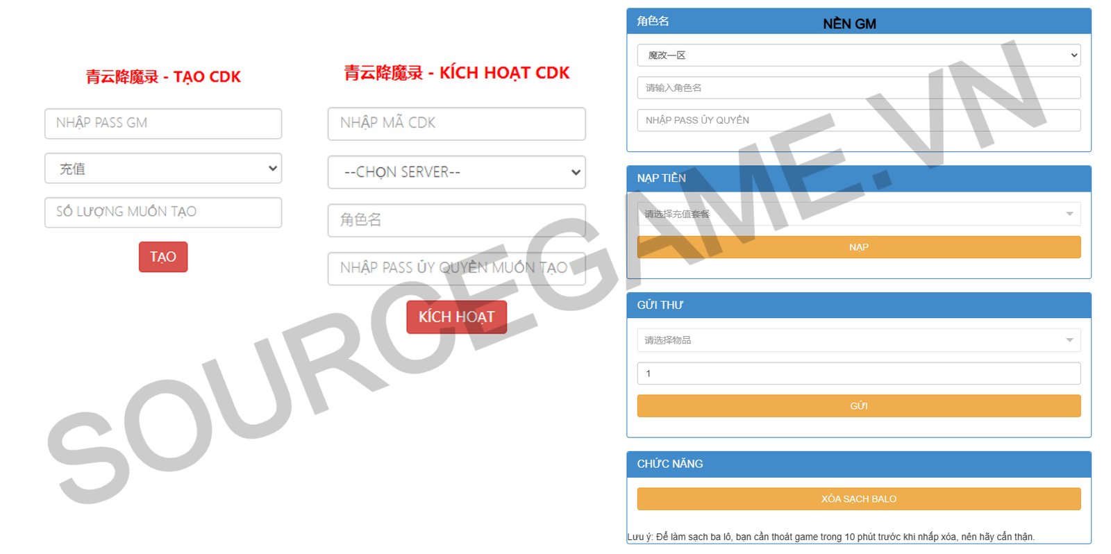Mô tả: MÃ NGUỒN BAO GỒM SERVER, CLIENT APK IOS, NỀN GM, CLIENT VIỆT HÓA 95%, NỀN GM VIỆT HÓA 95%, VĂN BẢN HƯỚNG DẪN CÀI ĐẶT, MÃ NGUỒN CHẠY TRÊN VPS CENTOS